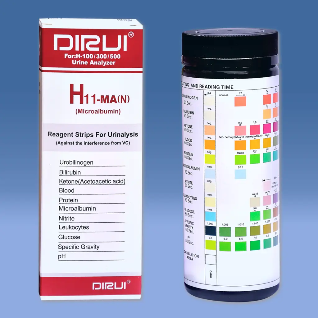 Las tiras de uroanálisis de la serie DIRUI H11 MA están hechas para uroanálisis tanto cualitativos como semicuantitativos. Los resultados en las tiras se pueden leer visual e instrumentalmente.